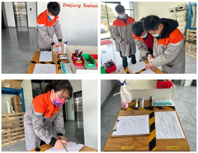 员工每天按要求扫码(嘉行码)进入公司,完成消毒、测温、健康登记一系列防疫项目,一项不落严格执行。