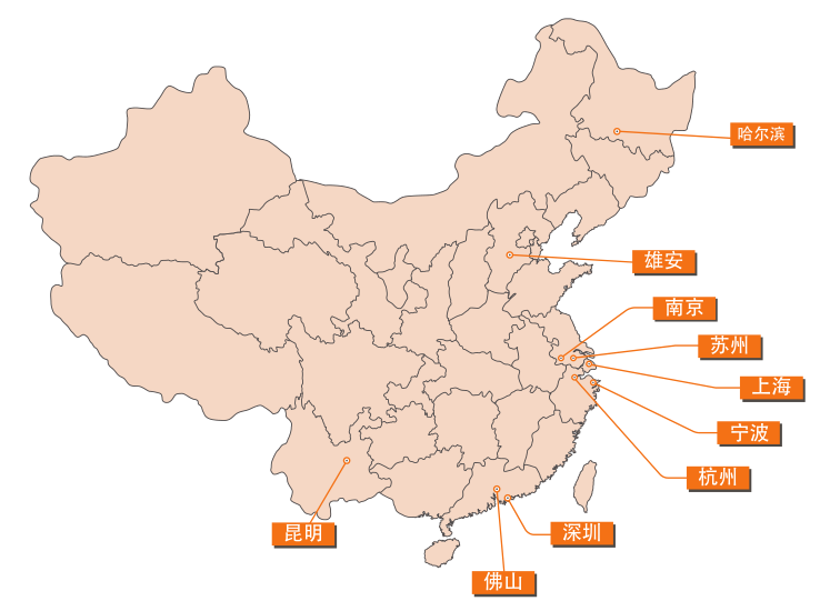 支撑轴力伺服系统在以下15座城市中70余个基坑内成功实施,伺服支撑头总成使用数量6000+。