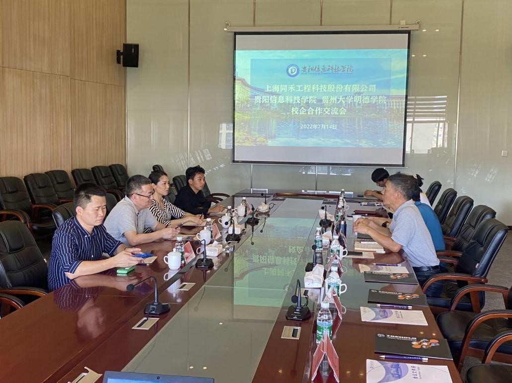 7月14日, 与贵阳信息科技学院联合召开了校企合作交流会,共同交流人才培养战略,校企合作共谋发展。 总经理姚鸿梁一行,贵阳信息科技学院董事会副董事长谢田凯、副院长杨波,土木工程系主任王贵禄、土木工程系党总支书记吴海燕及学院相关负责人参加了交流会。