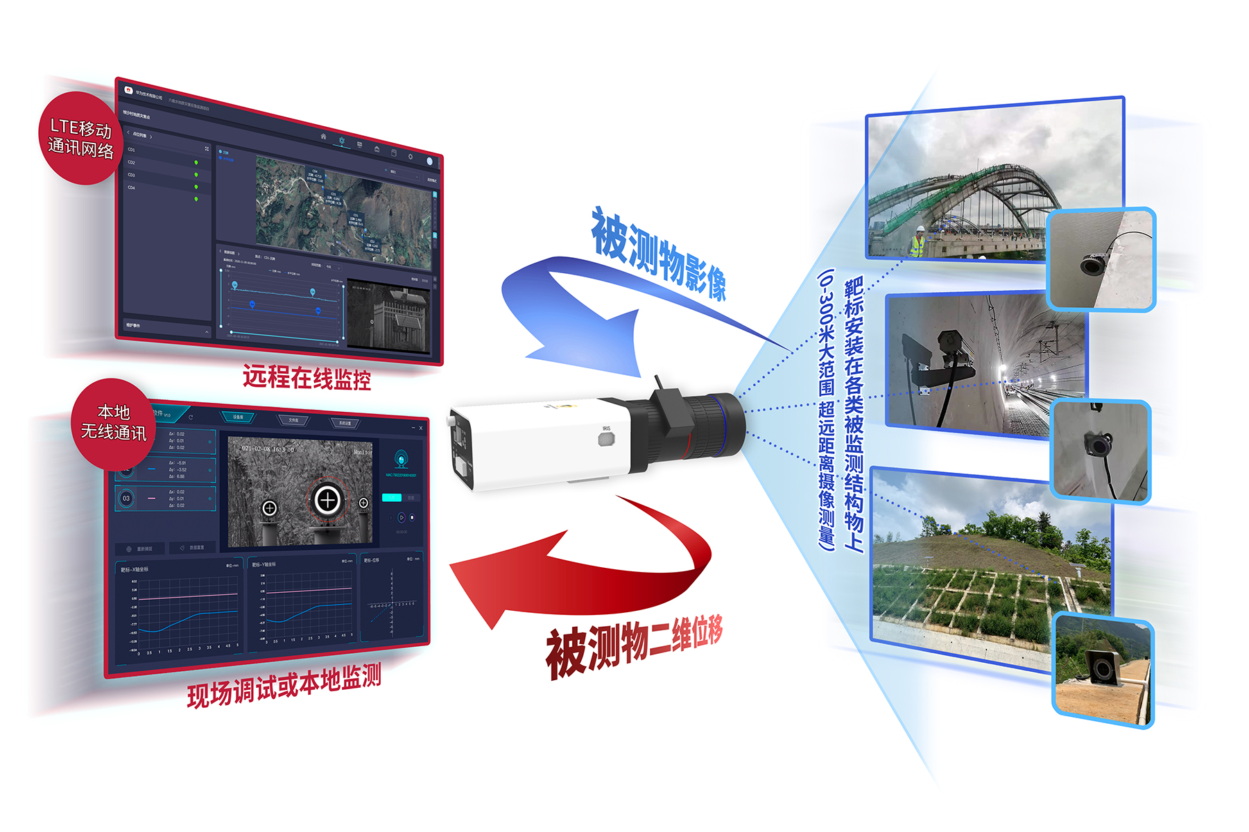 该解决方案以机器视觉技术、物联网通讯技术、大数据人工智能技术为核心,能够对各类土木工程结构物进行超高精度、非接触式的实时测量,感知可能存在的结构风险,及时预警,进而为结构物全生命周期的安全管控及养护管理提供决策依据。