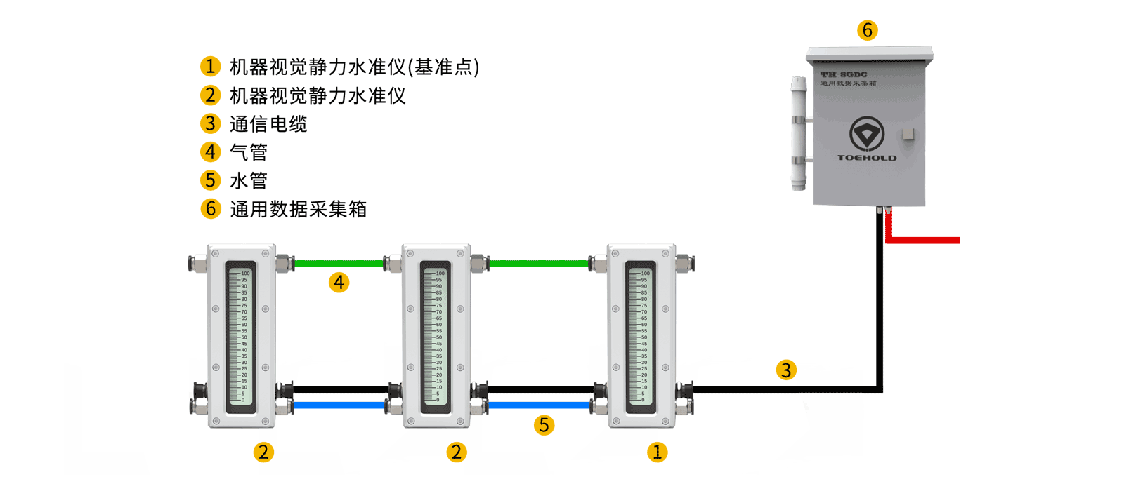 机器视觉静力水准系统主要由静力水准仪(测点)、连接线缆(包括数据总线、水管、气管)及通用数据采集箱组成。可以在被测结构物上布置静力水准测线以获得各测点的高程数据。