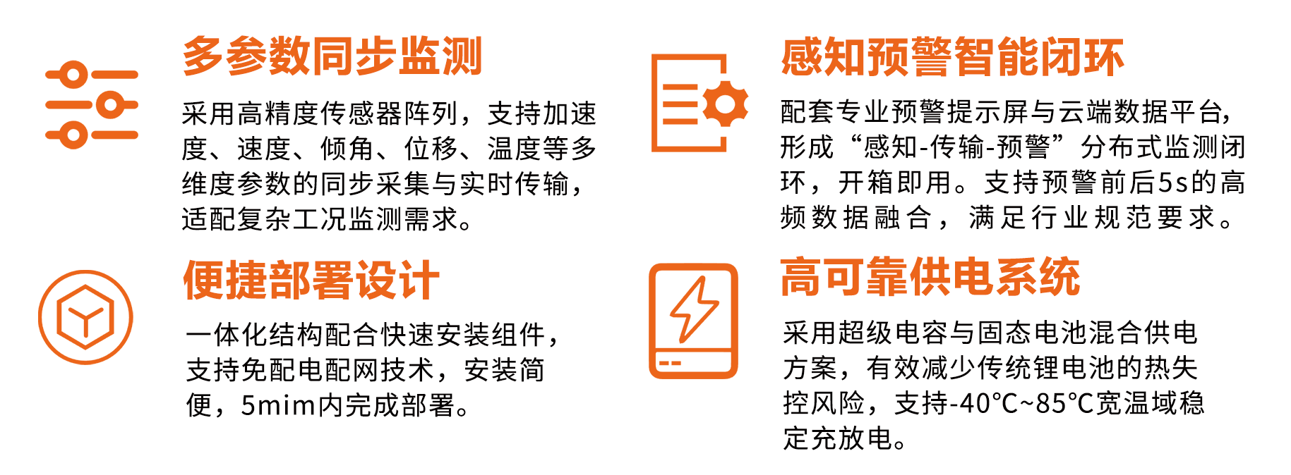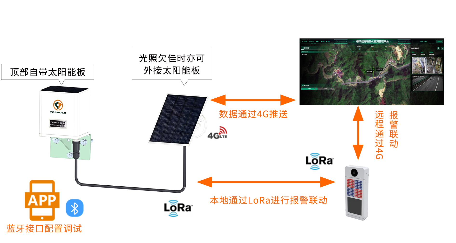 设备内置4G传输模块和大容量电池,外部连接一块太阳能光伏板,无需依赖外部供电供网(定点上传模式下可工作5~8年),现场可实现快速部署;具备远程升级、远程配置、低功耗管理、本地蓝牙配置调试等多种功能。设备能实现长周期趋势监测及突发状况下的异常报警,有效提升使用和维护效率,降低运营综合成本。