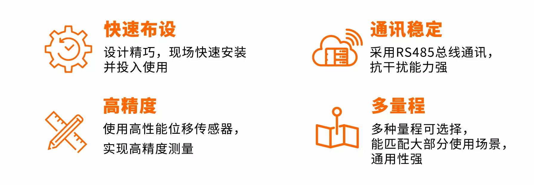 拉绳式裂缝计内置高精度直线位移传感器,并由内部电路将位移量进行数字化输出。主要用于边坡、大坝、建筑物等结构物的裂缝监测,也可用于桥梁支座位移的监测。在长期监测过程中,拉绳式裂缝计定时采集数据上传到云平台,当检测到裂缝超限值或有持续变大的趋势,可提前发出预警,减少人员伤亡和财产损失。