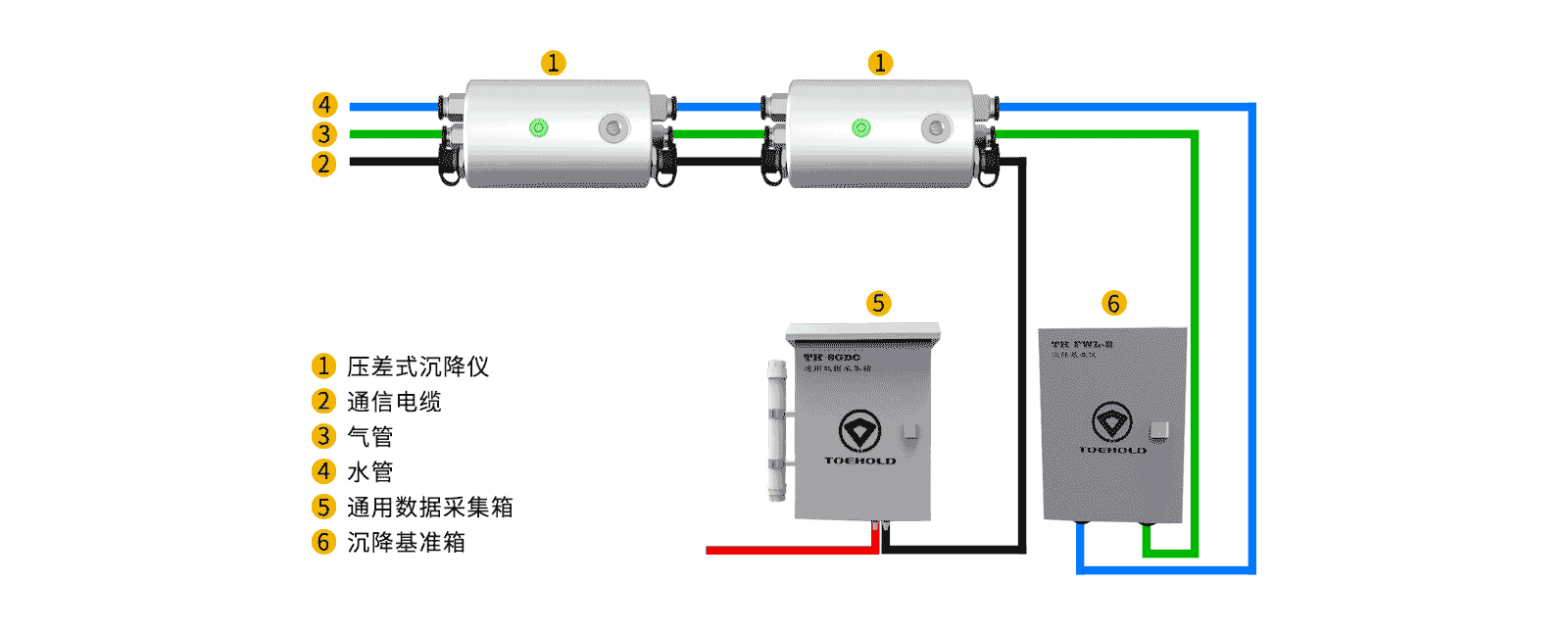 压差式沉降仪系统主要由压差式沉降仪(测点) 、连接线缆(包括数据总线、水管、气管) 、沉降基准箱及通用数据采集箱组成。