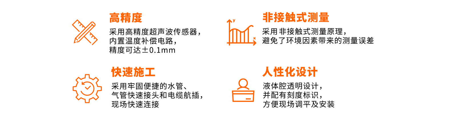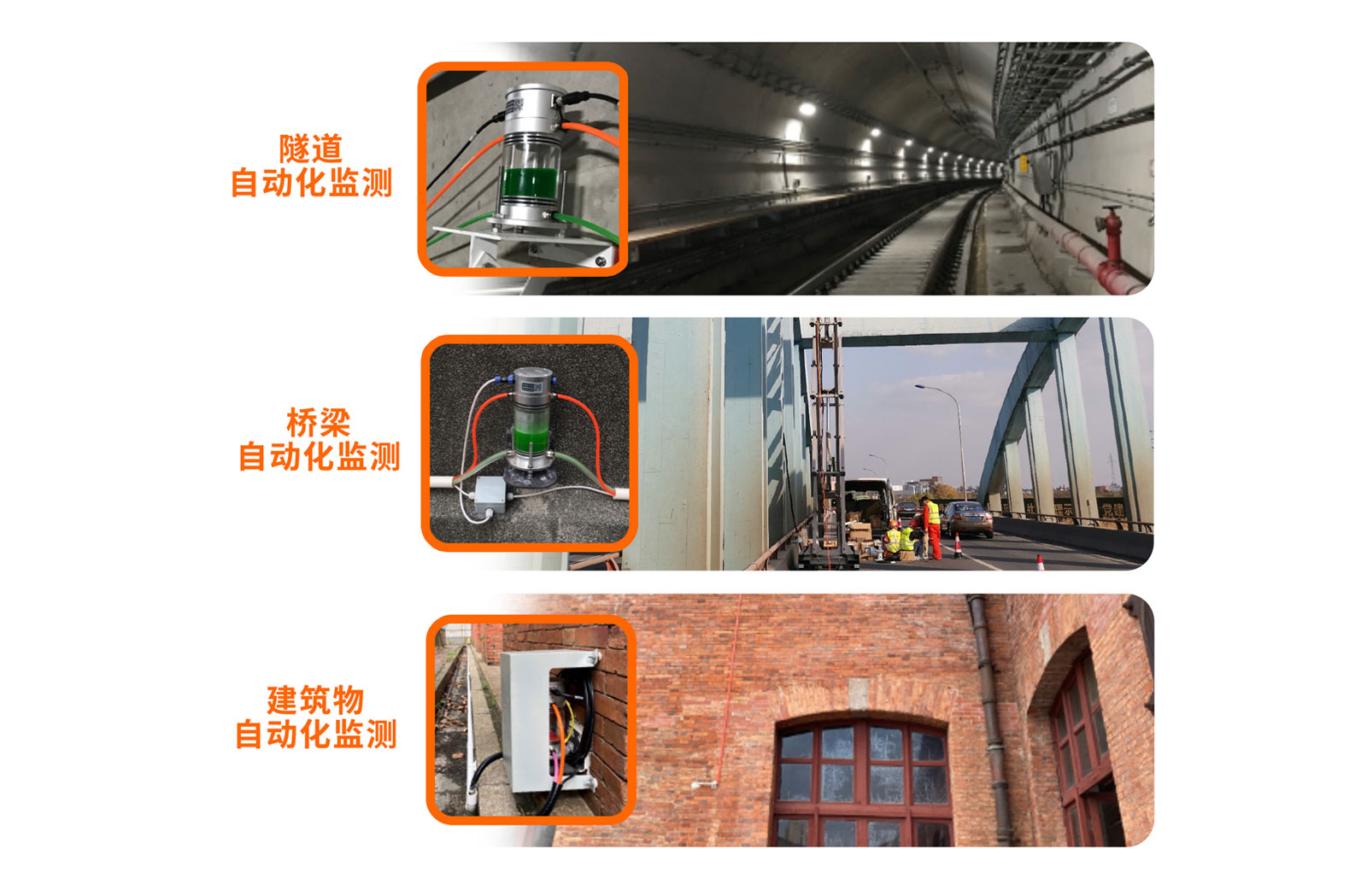 非接触式静力水准仪内部配有工业级的超声波传感器,采用超声波反射原理,间接测得仪器内部液面高度,平台间接算出结构物沉降。本产品安装于结构物表面,可应用于桥梁、隧道、建筑物等结构物的沉降监测。