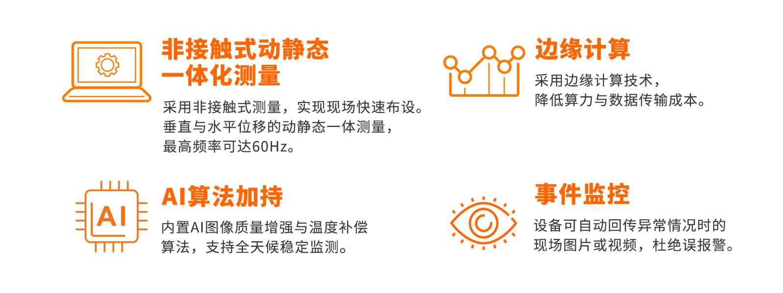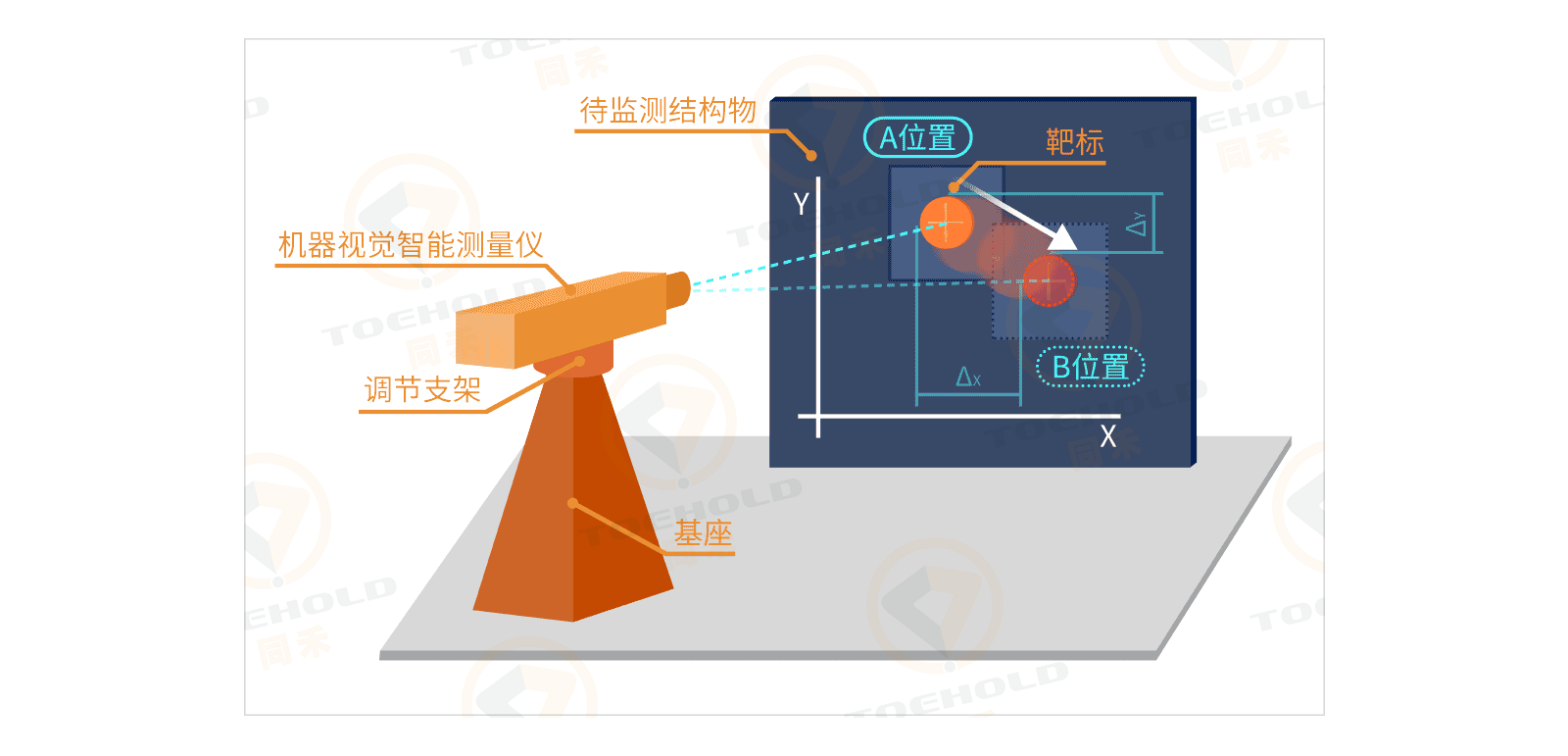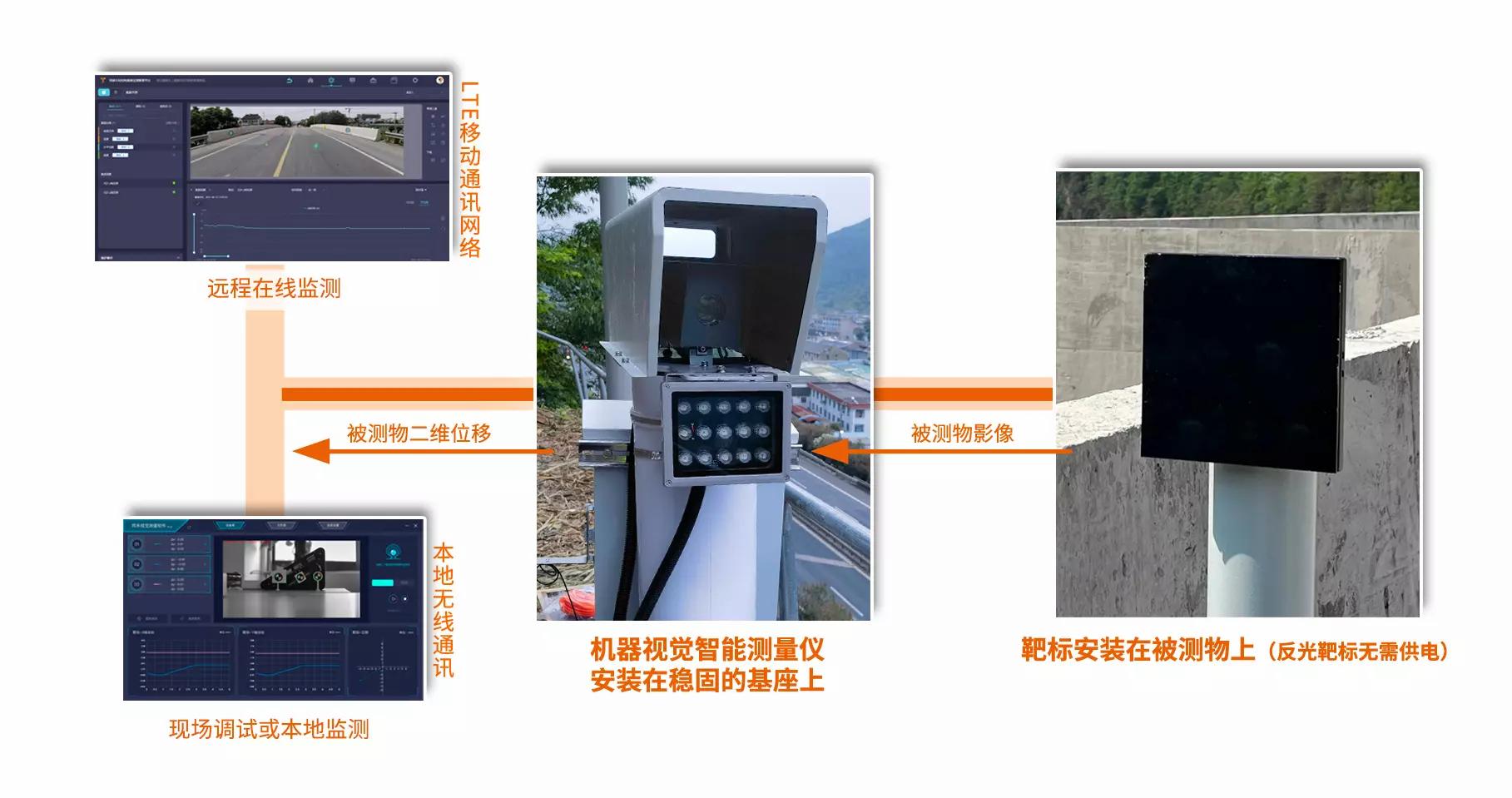机器视觉智能测量系统采用物联网技术及智能灾变识别算法将图像数据转化为变形数据,实现对各类土木工程结构物的超高精度非接触式实时测量,达到对结构物健康状况全天候监测的目的。该系统由机器视觉智能测量仪、靶标、机器视觉调试软件、同感云结构物健康监测管理平台组成。