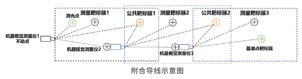 在长距离隧道测量或者长距离、大弧形水库大坝的测量中,用单台机器视觉智能测量仪进行监测存在单个相机的机器视觉监测系统受限于图像采集设备的视场,难以覆盖整个监测结构物范围的问题。采用“机器视觉传递测量技术“可以解决以上难题,通过多台测量仪前向传递的方式,形成附和测量导线,并结合测量仪转点测算算法,实现长距离或曲线测量。