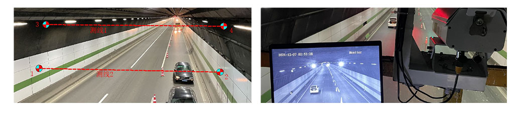 项目采用机器视觉智能测量仪对隧道结构进行实时监测。隧道跨中拱顶安装1台测量仪,两侧对称安装4个靶标组成两条测线,对收敛情况进行监测。