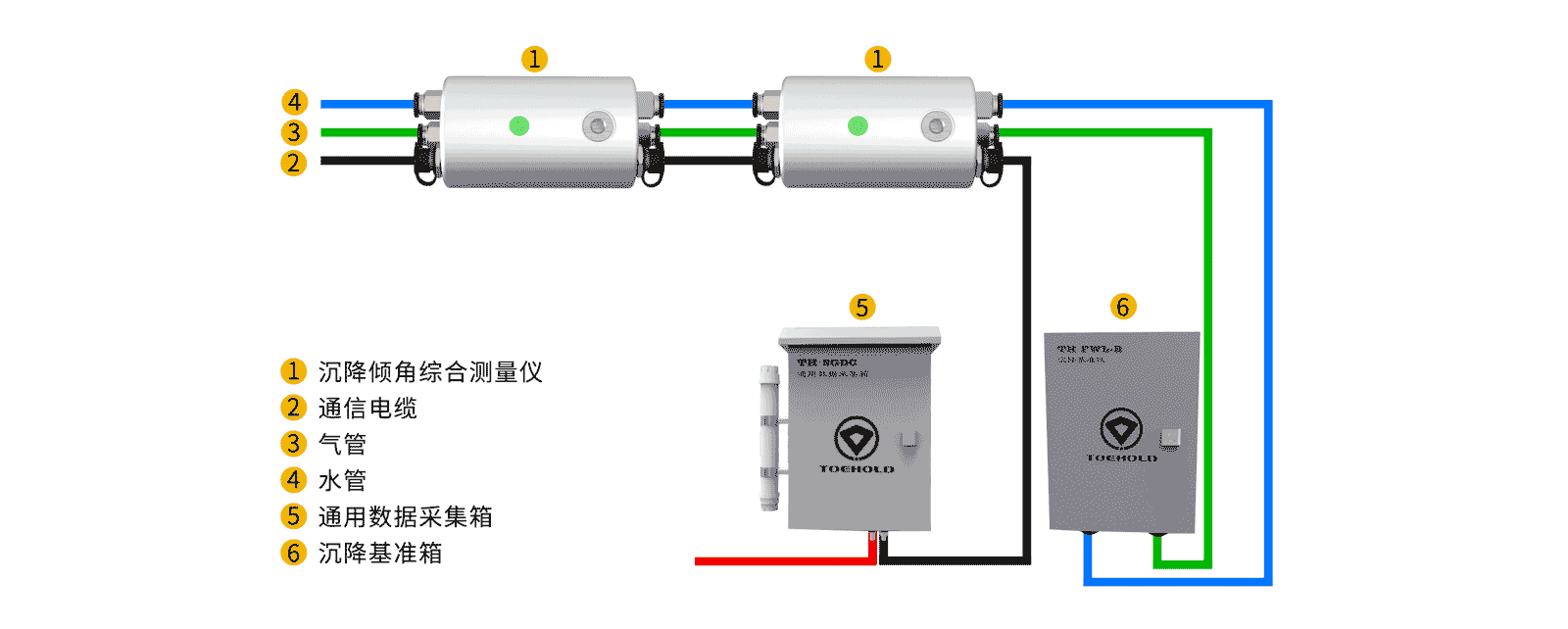 沉降倾角综合测量系统主要由沉降倾角综合测量仪(内置压力和倾角传感器) 、连接线缆(包括数据总线、水管、气管) 、沉降基准箱(可选)及通用数据采集箱组成。
