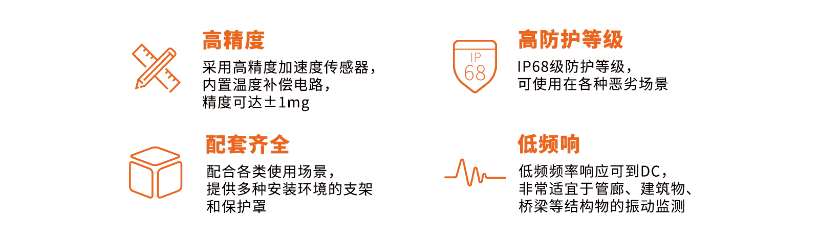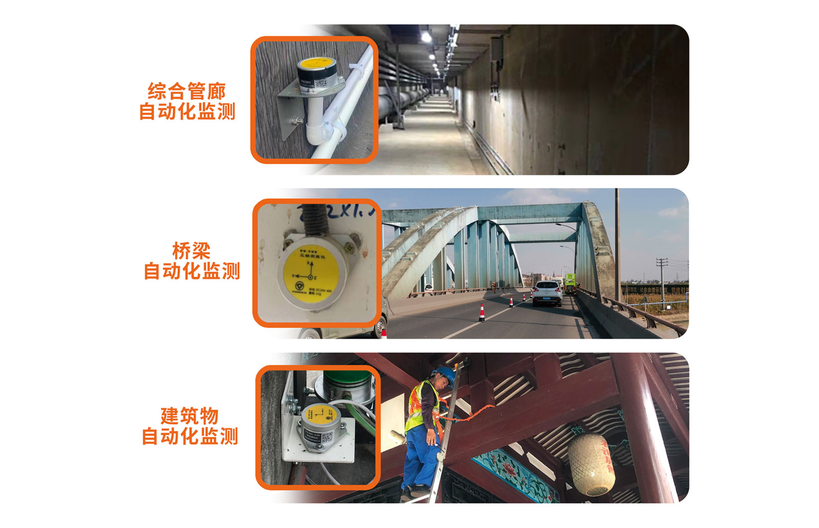 本产品安装于结构物表面,可应用于建筑物、桥梁、隧道、管廊、大坝等结构物的振动监测,也可用于桥梁的索力监测。