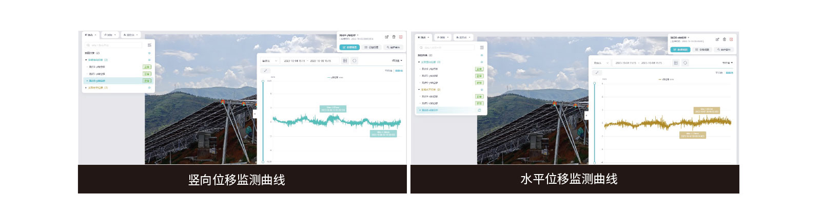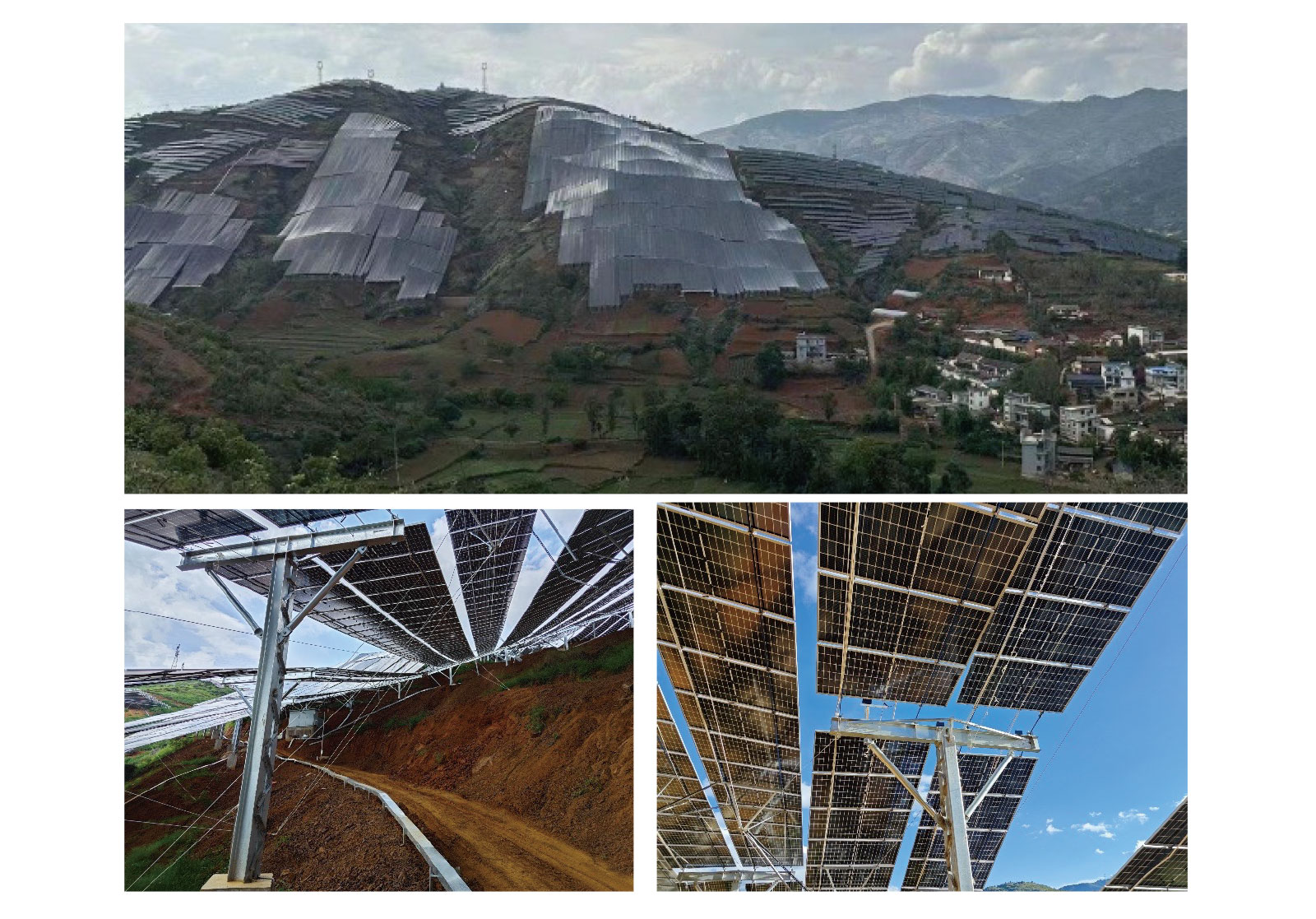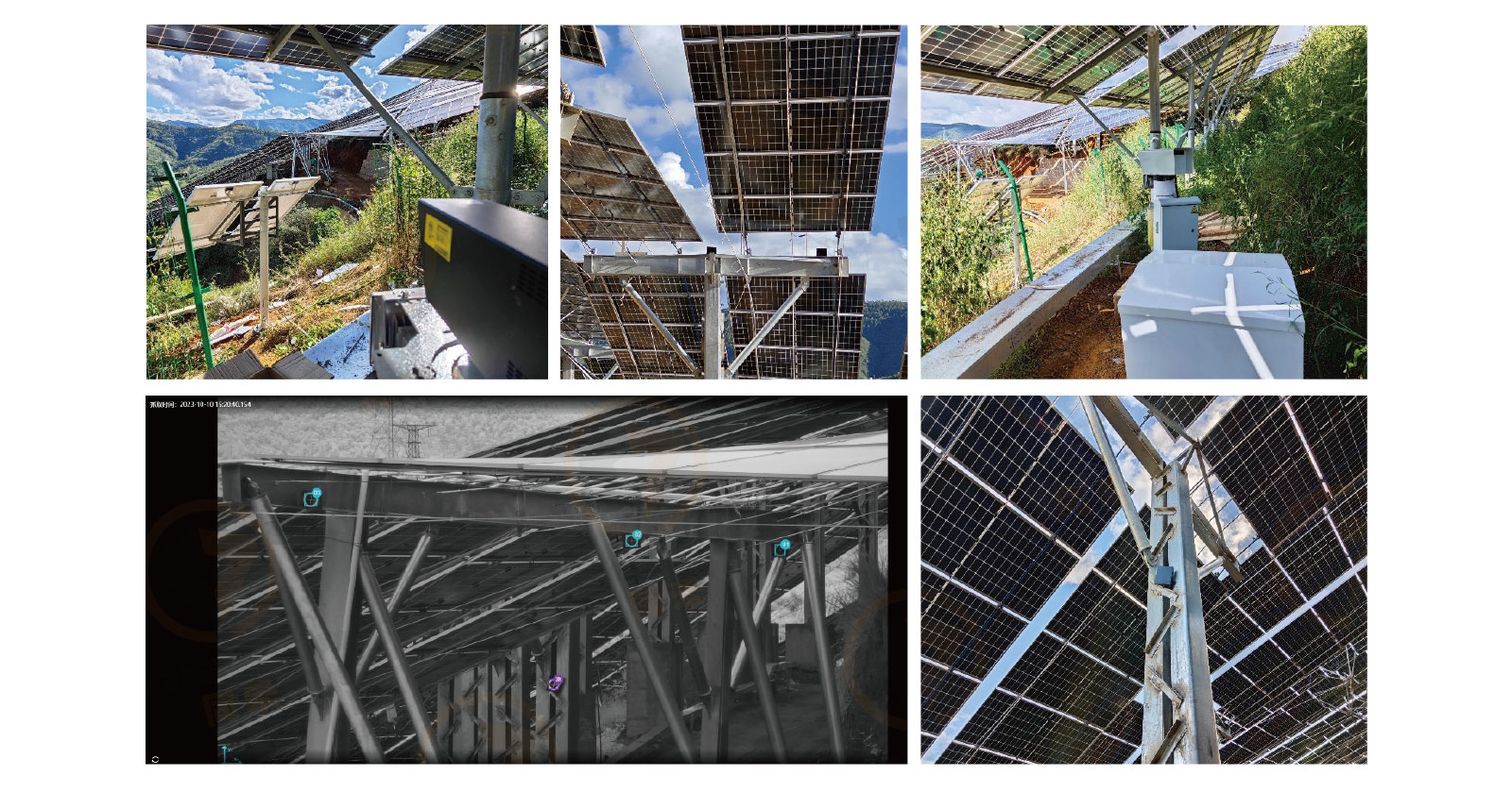 该光伏发电的组件支架采用三索结构柔性支架,以固定倾角和随坡就势的方式安装。单组柔性支架总长度在180m~400m之间,高差范围在60~140m,整体坡度在19°~28°之间,局部超过35°,单跨范围主要在30~60m之间,立柱高度范围主要在2.5m~5m之间。拉索钢绞线公称直径17.8mm。项目针对发电站的已建柔性支架结构开展监测设计,在受力、变形较大,易损、影响主要部件和结构整体安全耐久的位置,布置监测结构变化的测点,动态监控已建柔性支架运行状态、掌握运行规律,为相关单位提供基础数据,开展科研试验与设计验证。