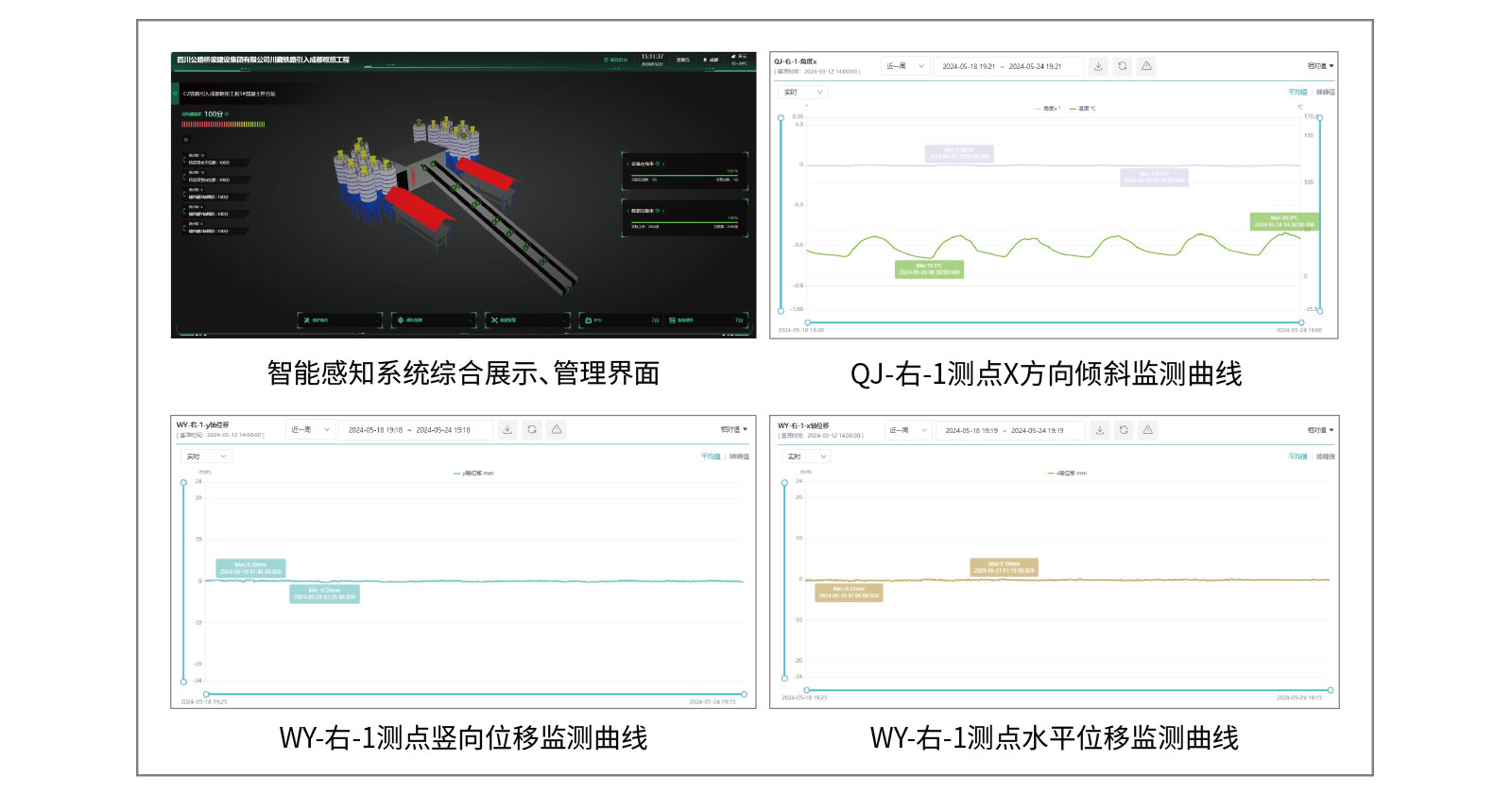 通过安全监测系统的建设,实现了高铁混凝土搅拌站安全监测数据的高精度实时采传、三维智能展示、全寿命统计分析,达到了对结构物安全进行智能感知和智慧管理的效果。自设备上线以来,各测点数值稳定,传送带水平/竖向位移及储料罐倾斜均未发生明显异常变化,搅拌站设施处于健康运行状态。