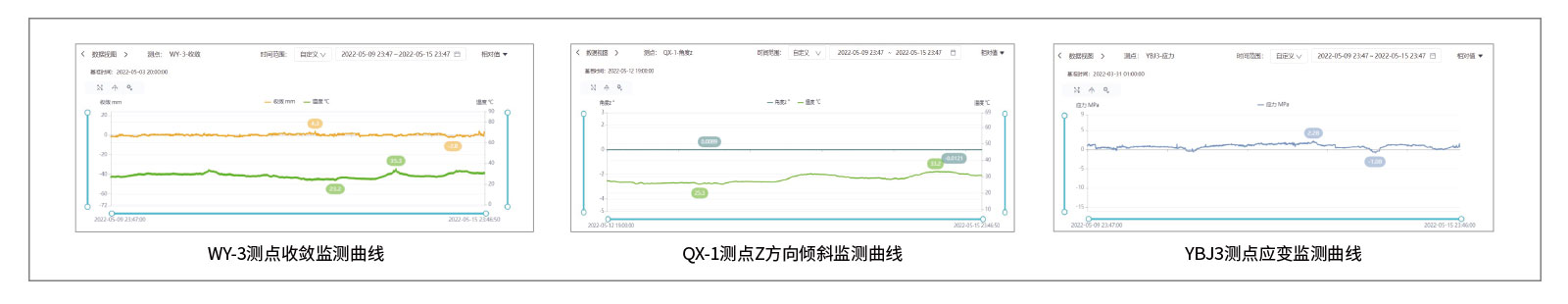 项目采用4个倾角测量仪、4个激光收敛计和8个弦式表面应变计分别对立柱的倾斜、位移、轴力进行监测,并在监测区域附近设置一个声光报警器辅助现场声光报警。