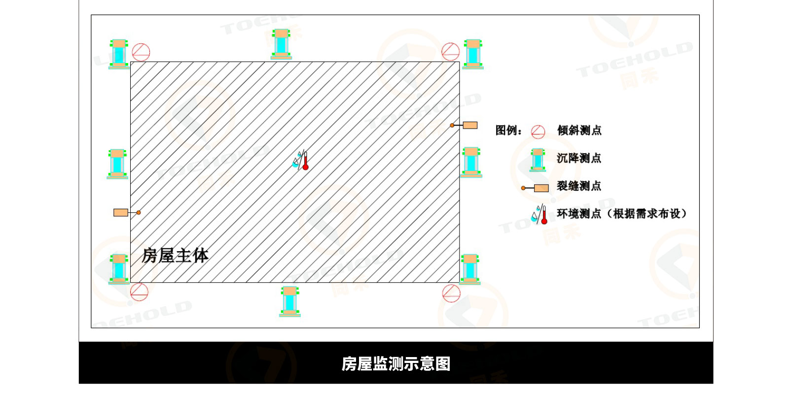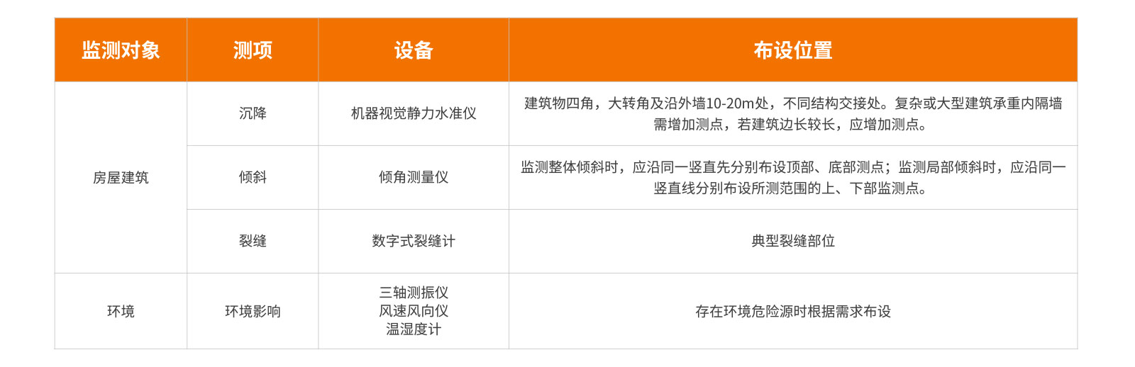 房屋建筑结构监测宜以变形监测为主,变形测量具有“测得准”、“分析得了”的优点,还可同时配合环境监测,直观反映结构健康状态。变形测量包括“沉降”和“倾斜”测量,同时结构裂缝会降低结构刚度,致使结构变形增加。因此,“裂缝”也是房屋监测中较为重要的测项。某些房屋建筑由于周边存在施工影响,其振动会导致房屋出现疲劳损伤,这种情况下也可对 “振动”、“风速风向”和“温湿度”等环境测项进行监测。