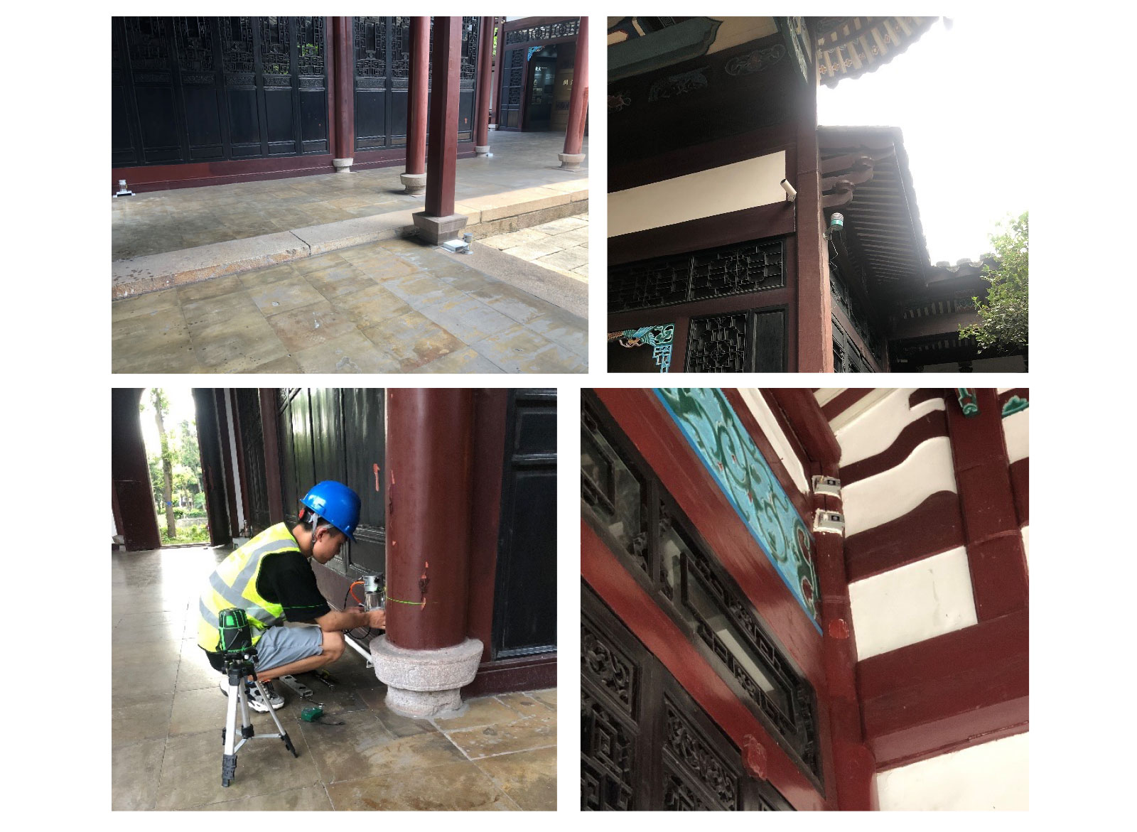 该祠堂已有一百多年历史,为全国重点文物保护单位,考虑建筑物建设年代久远,为保证能够提前预警建筑物因结构老化而可能出现的病害及破坏,对结构沉降、倾角、振动、裂缝展开监测。分别采用20台非接触式静力水准仪,12台倾角测量仪,5台三轴加速度计和3台数字式裂缝计对各物理量进行监测。