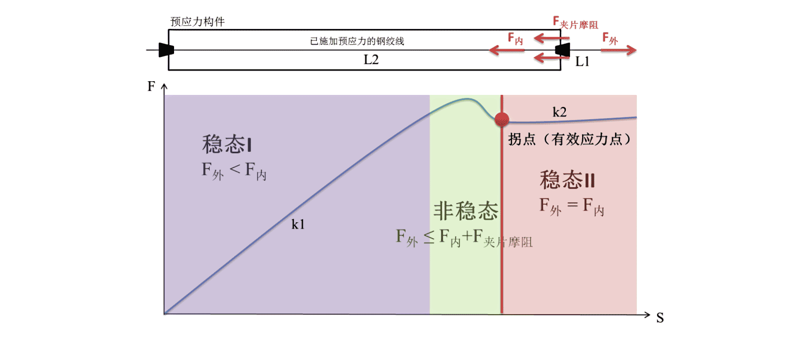 复张过程中,外部钢绞线会经历从稳态到非稳态再重新进入稳态的过程,第二次进入稳态时的拐点拉力就是预应力钢筋中的有效应力。